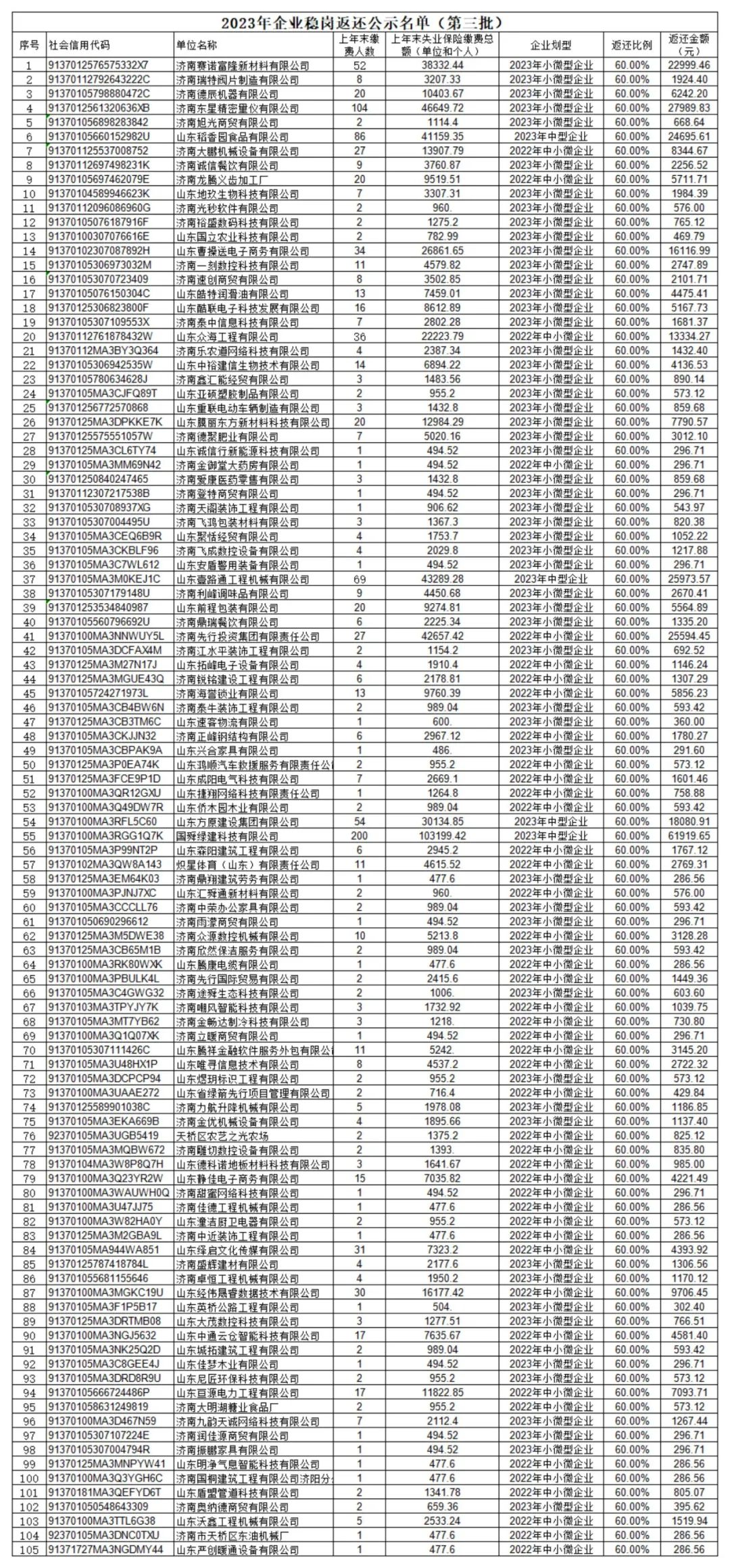 根据《山东省人力资源和社会保障厅关于做好近期失业保险稳就业政策落实有关工作的通知》(鲁人社函〔2023〕70号)、《济南市人民政府办公厅关于印发济南稳定和扩大就业促进经济社会高质量发展的实施方案的通知》(济政办发〔2023〕10号)等文件精神,经审核,拟给济南赛诺富隆新材料有限公司等105家参保单位发放“企业稳岗返还”,现予公示(名单附后)。