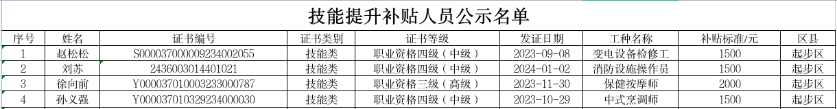 济南起步区技能提升补贴人员公示名单(2024年3月)