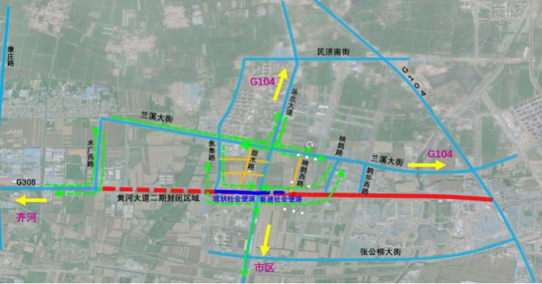 驻区车辆绕行路线:G308西向来车可通过水厂西路-兰溪大街(西延)-泺北大道、G104通过导改区域;泺北大道北向来车可通过焦集路、映鹊路-G308社会便道-泺北大道通过导改区域;南向市区穿黄隧道来车可通过焦集路、映鹊路向东向西绕过导改区域。