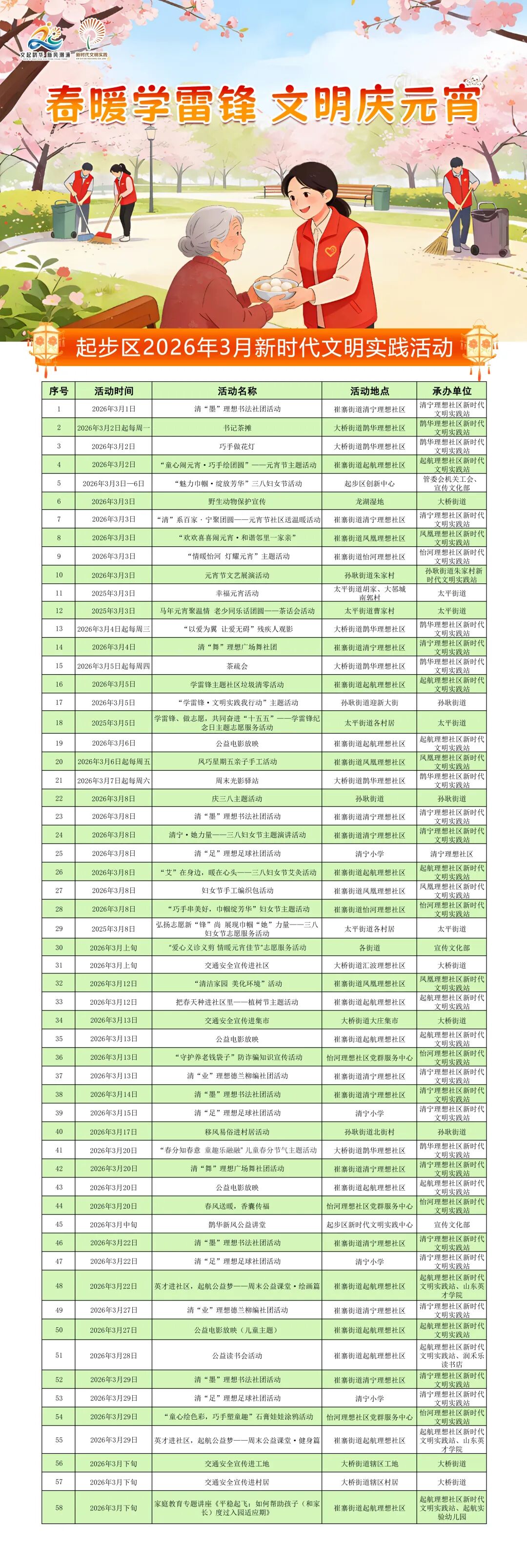 起步区按照“文明实践月月行”活动要求,3月份,以“我们的节日·元宵”等为抓手,结合“3.5学雷锋纪念日”,举办灯谜竞猜、元宵制作、传统民俗节目展演、“学雷锋·文明实践我行动”等活动,开展文明出行、文明旅游、文明上网宣传,引导社会团体、市民群众广泛开展志愿服务,弘扬奉献精神,传承中华优秀传统文化。现将部分活动进行预告,欢迎广大市民群众积极参与。