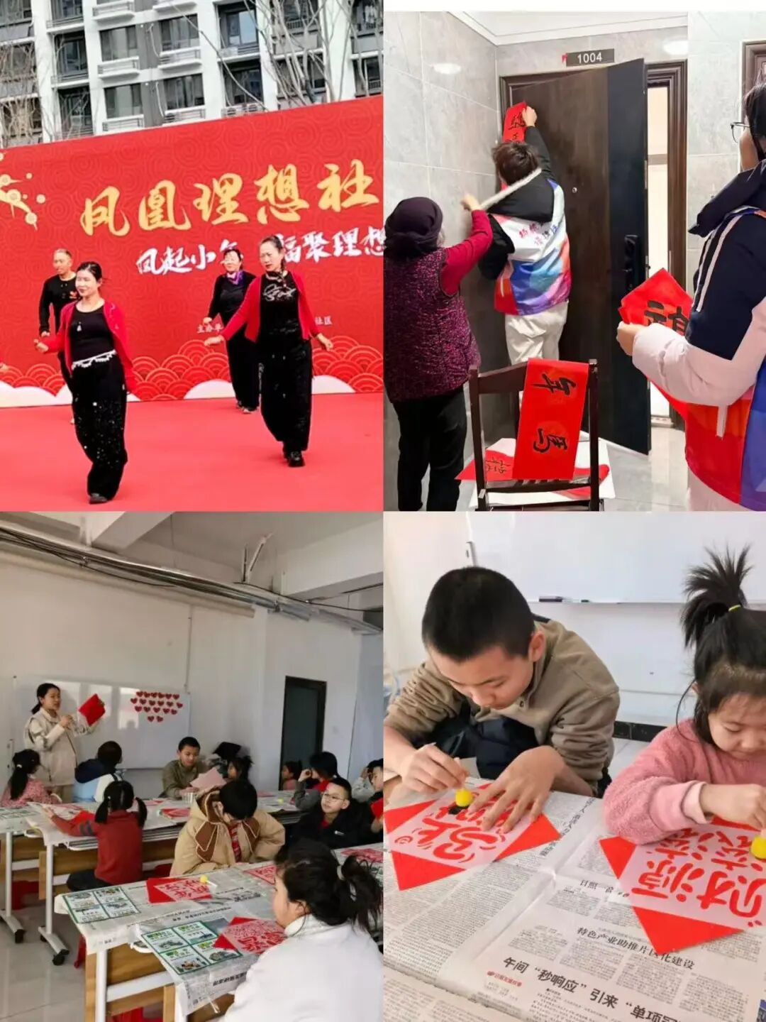 崔寨街道洋溢着欢乐的团聚氛围。各理想社区活动缤纷:凤凰社区“喜乐汇”集便民服务、健康义诊、猜灯谜、送福字于一体;起航社区组织儿童参与园区大扫除、为邻里和独居老人送“福”上门,并开设健康知识课堂;怡河社区的亲子拓印“福”字活动,让传统技艺在家庭互动中传承;河润社区则墨香四溢,书法爱好者写福送福,志愿者分队将祝福精准送至高龄、独居老人及辖区商户手中,温情流淌。