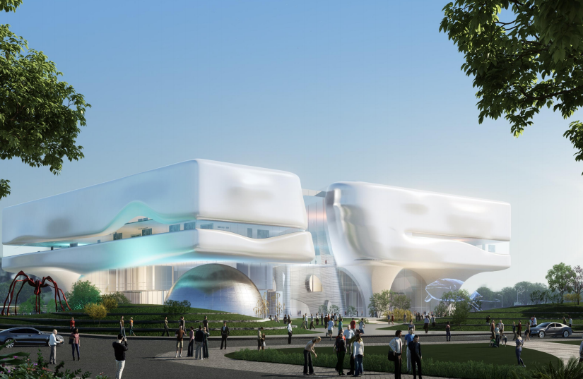 项目位于大桥街道,占地54亩,建筑面积8.0万平方米。由清华大学建筑设计院庄惟敏院士主持设计,以“泉韵”为设计理念,通过彩釉玻璃的空间变化模拟“泉水”意境,诠释济南“泉文化”文脉。建筑功能包含展厅展览区、休闲体验区、球幕影院、办公区等。