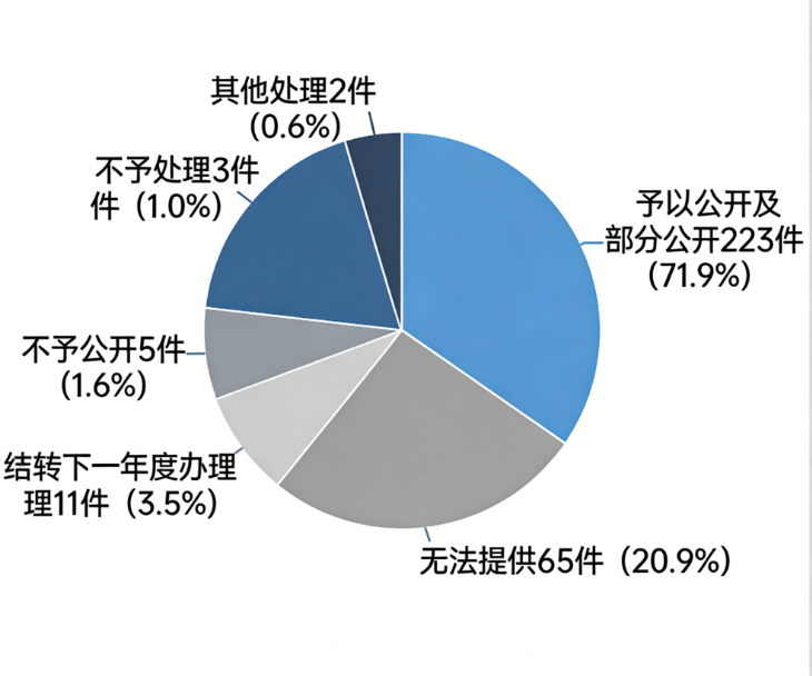 全年新受理政府信息公开申请299件,上年结转11件,共计310件。其中299件均在法定期限内予以答复,11件按规定结转下年度办理。予以公开及部分公开223件,不予公开5件,无法提供65件,不予处理3件,其他处理2件,结转下一年度办理11件。办理情况被行政复议8件、2件被责令纠正,1件虽被行政诉讼但维持原结果。