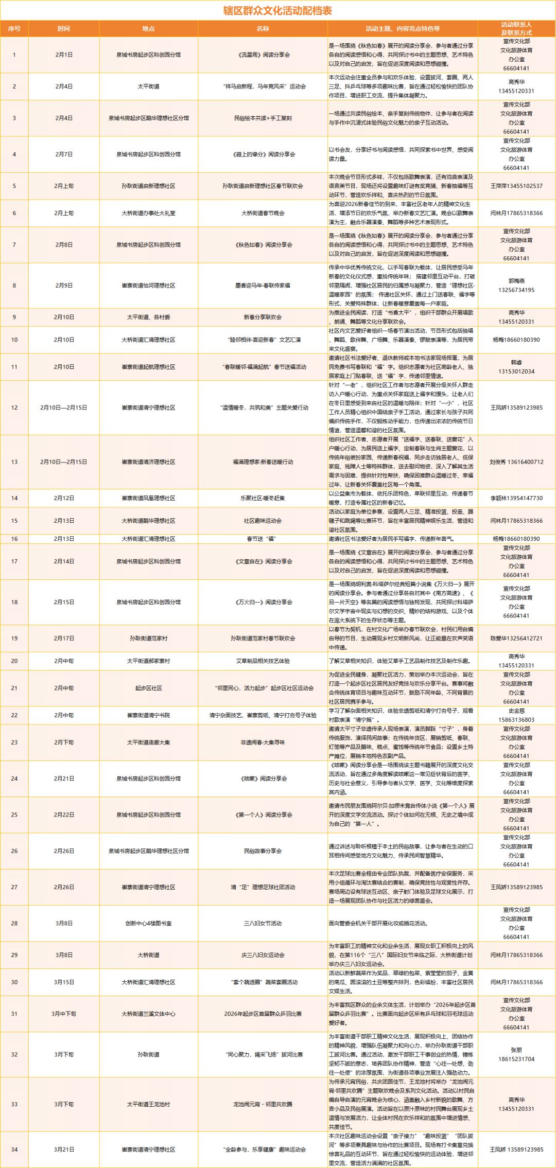 与此同时,各街道社区的年味大餐也即将上演。全民健身类活动精彩纷呈,象棋对弈、乒羽竞技、拔河比拼、趣味运动会等轮番上阵;文化传承类活动温情满满,手写春联、非遗手作、剪纸体验、民俗故事分享等带你重拾传统年俗;更有社区春节联欢晚会、元宵喜乐会接连上演,让邻里情谊在欢声笑语中升温,让社区氛围愈发温馨祥和、其乐融融。