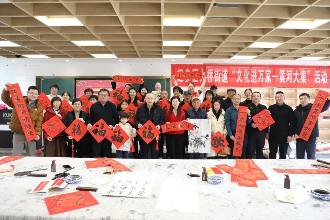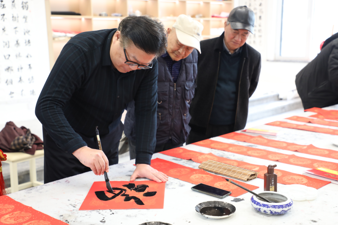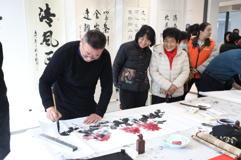 随着交流环节的推进,活动氛围在阵阵墨香中推向高潮,耿晏、季竹君、董罡等艺术家挥毫泼墨,将新春祝福凝注于笔端。一幅幅笔力遒劲的春联、一个个寓意吉祥的“福”字,还有融入鹊华秋色、黄河风光的写意国画,被陆续送到群众手中。“这‘福’字写得真好,既添年味又有气势!”拿到春联的社区老人李大爷喜笑颜开。现场欢声笑语不断,红色的春联与群众的笑脸相映成趣,让社区书房成为传递新春祝福的温暖空间。