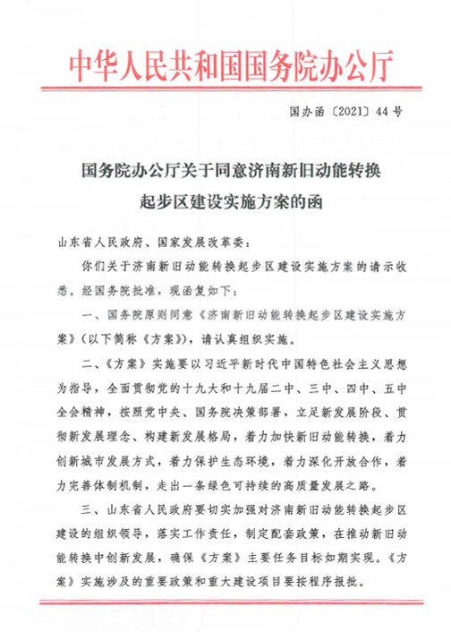 2021年4月25日 国务院批复同意《济南新旧动能转换起步区建设实施方案》