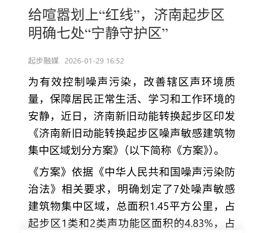 为有效控制噪声污染,改善辖区声环境质量,保障居民正常生活、学习和工作环境的安静,近日,济南新旧动能转换起步区印发《济南新旧动能转换起步区噪声敏感建筑物集中区域划分方案》(以下简称《方案》)。