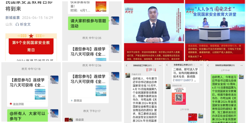 线上发力,扩大宣传覆盖面。线上通过微信公众号、居民群等推送总体国家安全观宣传海报、公益宣传片等内容让群众认清国家安全形势,组织领导干部发动干部群众收看山东省“人人争当国安卫士”国家安全教育公益课。提升街道机关干部对国家安全知识的知悉程度,切实增强全民国家安全意识,进一步掀起国家安全教育知识学习热潮。