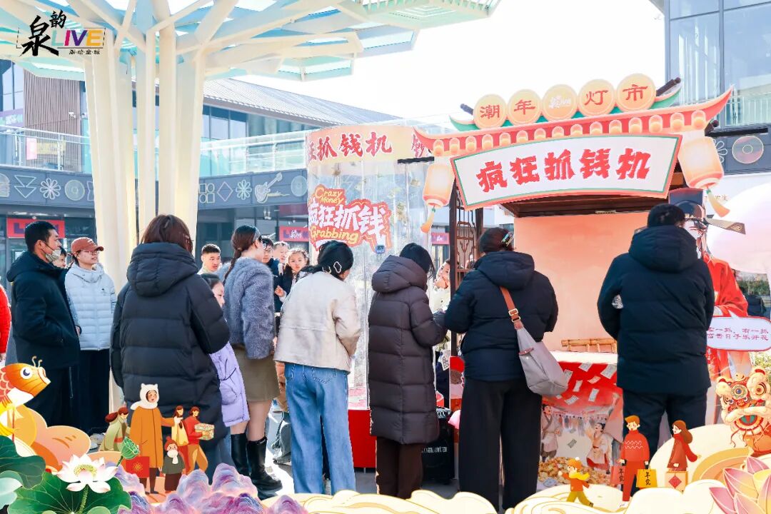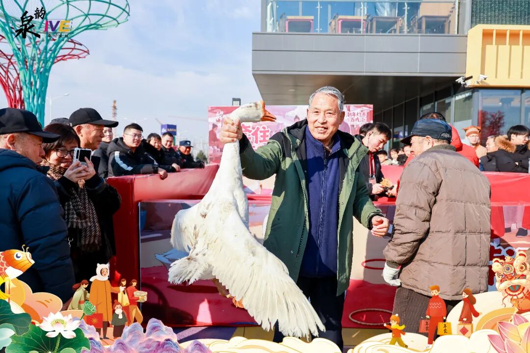 作为园区的人气聚集地,泉韵LIVE主题区完美诠释了“逛吃玩看”一站式体验。首先,是香气扑鼻的“吃货市集”:冰糖葫芦、滋滋作响的烤肉、各色地方小吃摊位前总排着队,满足游客味蕾。其次,是笑声不断的爆款游戏区:“套大鹅”“抓钱机”“套盲盒”等互动游戏吸引了大批游客一试身手。此外,全天轮番上演的舞狮、秧歌、锣鼓等传统民俗表演,让浓浓的年味充斥在每个角落。