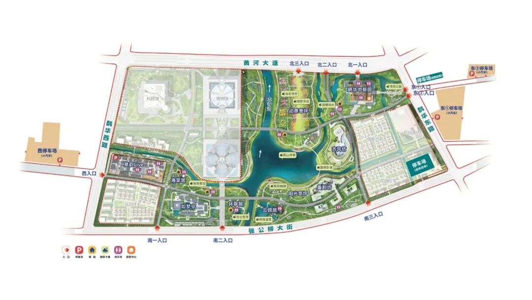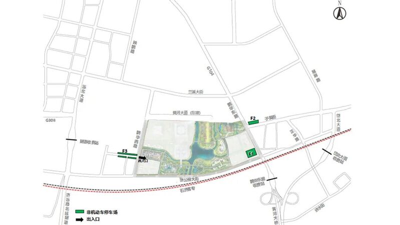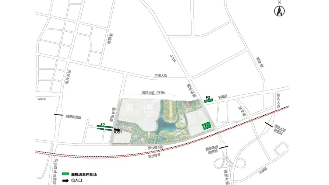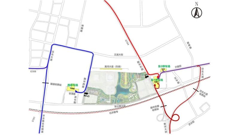 其中,黄河大桥方向车辆,建议走鹊华东路收费站-鹊华东路到东1停车场;或走岱北大道收费站-岱北大道-子美街到东2、东1停车场;