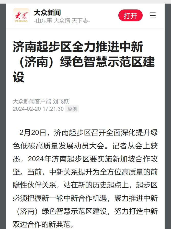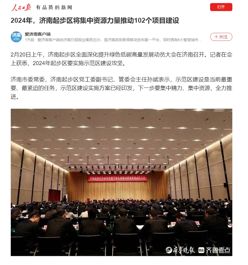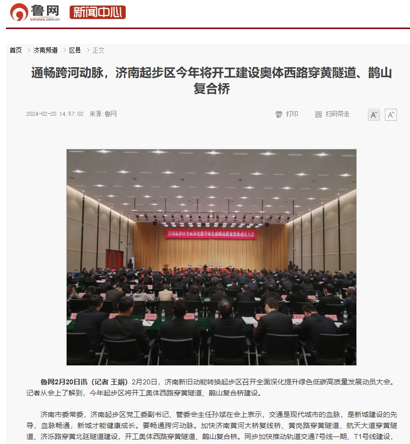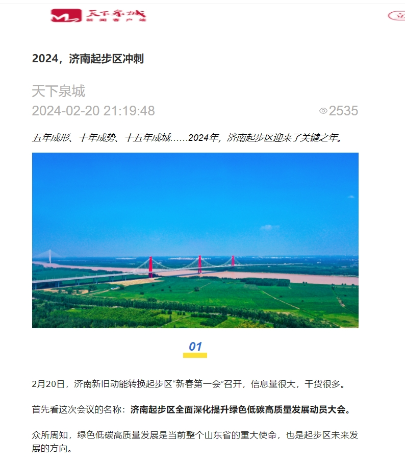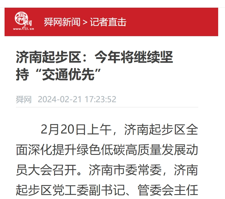 2024年2月20日上午,济南起步区全面深化提升绿色低碳高质量发展动员大会召开。全区动员大会吹响了“成形起势”的冲锋号,发出了“深化提升”的动员令。中央、省、市媒体围绕起步区建设发展成果和下一步重点工作,纷纷进行全面解读报道,截至22日,各级媒体发布相关报道共计370余篇,为起步区成形起势营造良好舆论氛围。